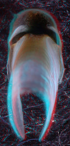 About anaglyph 3D: Photographs here are in 3D, using anaglyph techniques which combines two photographs one in red and the other in cyan (blue + green) color. To get the 3D effect, you must use glasses with red and cyan lenses (filters) over your regular glasses. The form of the beak is far easier to interpret in 3D and we strongly recommend to the viewer that the glasses be obtained (this is especially helpful when viewing enlarged images - i.e. click on the image). These beak photographs were made using Red and Cyan Anachrome Aviator Glasses (see: http://www.anachrome.com/glassbuy.htm or http://www.amazon.com) which cost under $10.00 (USD).